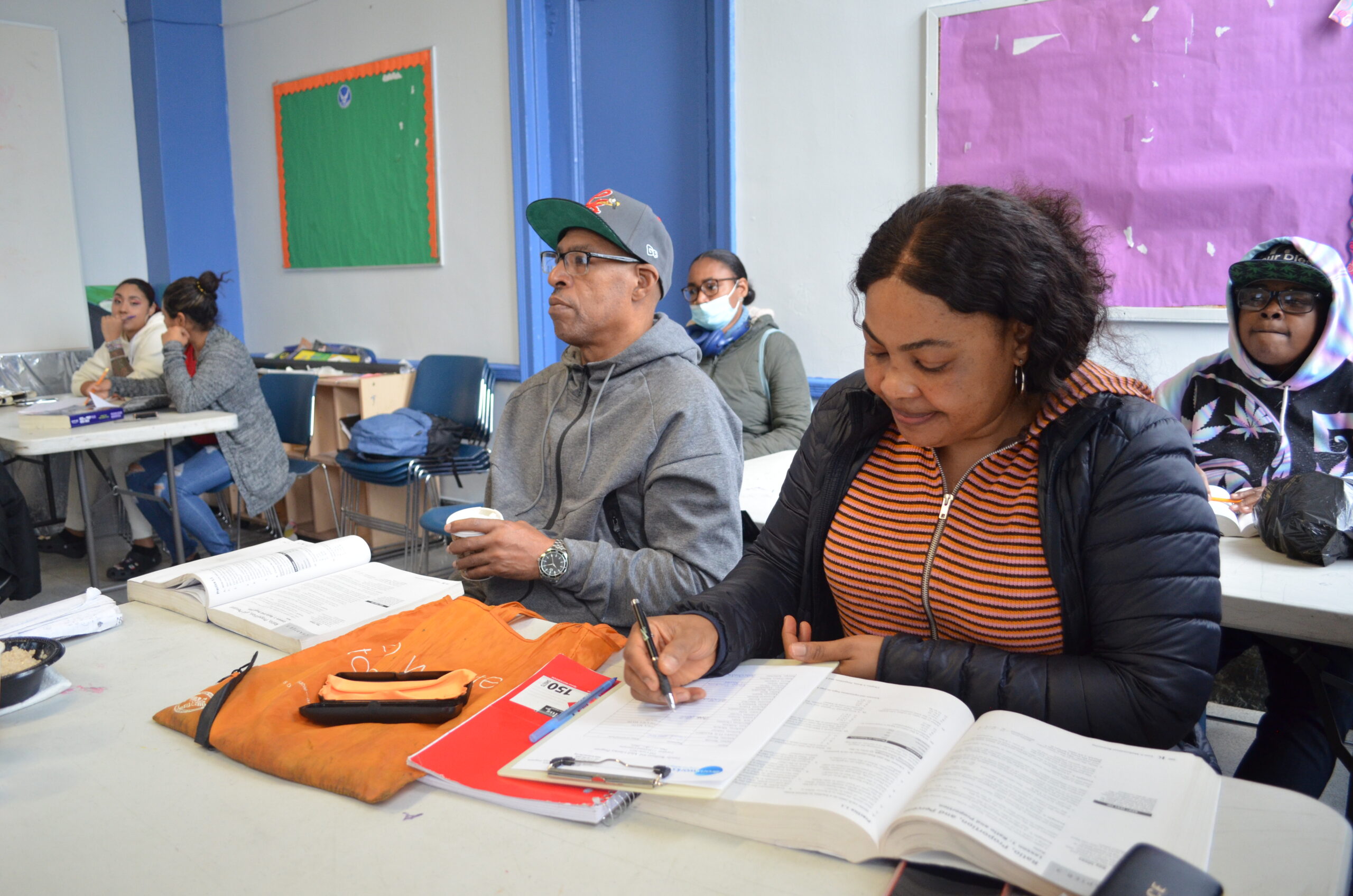 Anthonia (right, front) takes notes during a math lesson at a BronxWorks GED Prep class.